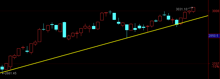 大盘总的趋势良好,按照上次给大家画的趋势线就可以看出了,目前量价的配合还算可以,但是热点的连续性不够强,没有持续攻击性的板块行情。拉升指数的行情中,中小盘不配合,震荡行情中,中小盘股活跃。大盘继续上涨,将碰到第一压力位置3054,关注压力面前的走势。
